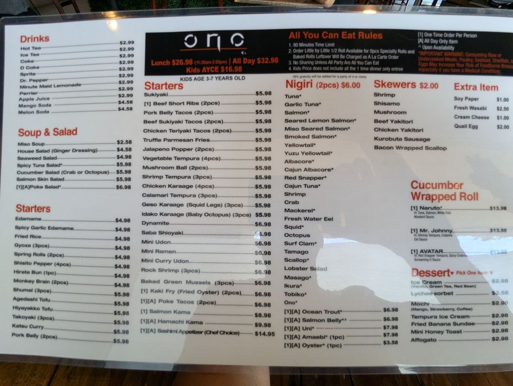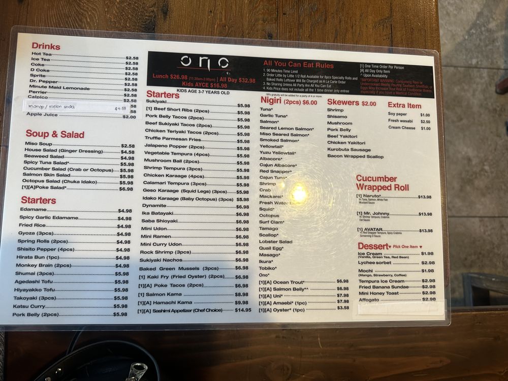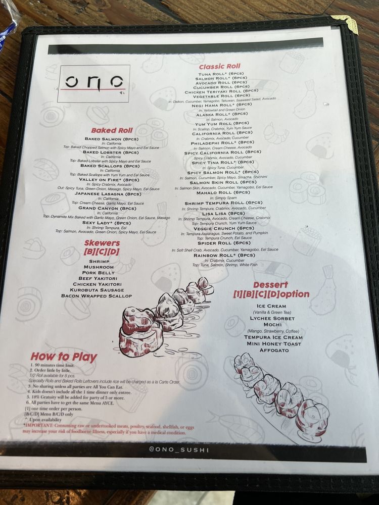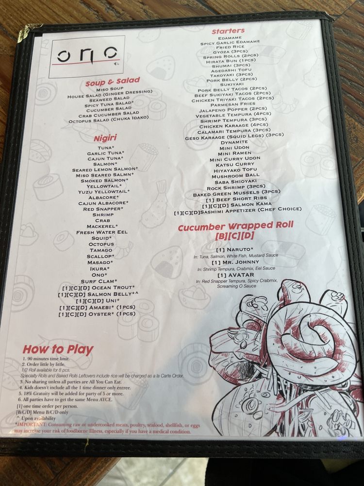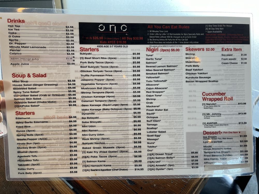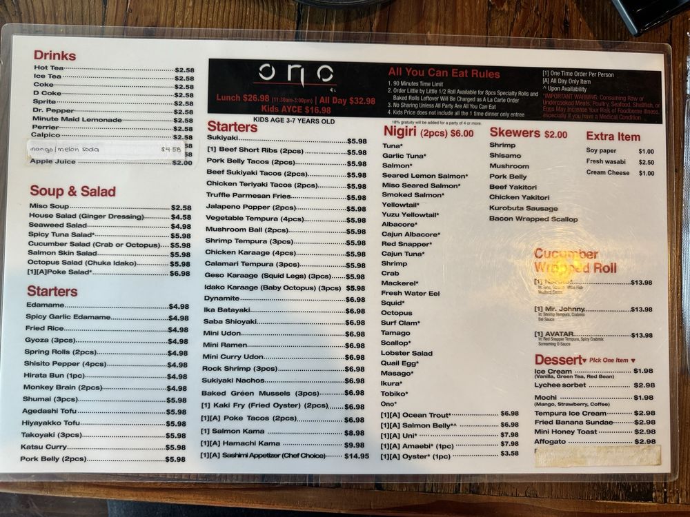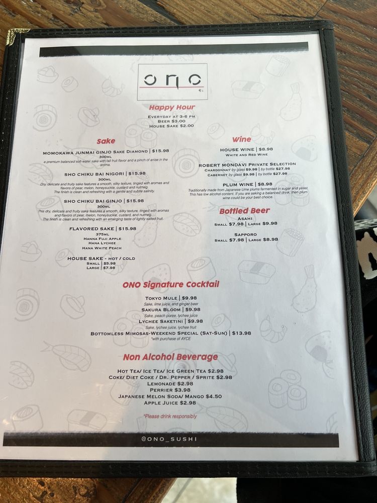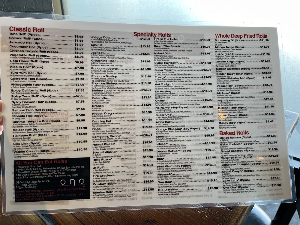 Ono Sushi offers a trendy and casual dining experience in Las Vegas, with a diverse menu that includes vegan options and limited vegetarian choices. The restaurant provides a range of utilities such as reservations, delivery, and takeout, with waiter service and happy hour specials available. The extensive drink menu features unique Japanese sodas and specialty teas. Starters like gyoza and shrimp tempura set the stage for an impressive array of sushi rolls, including fresh sashimi selections. The atmosphere is described as inviting, and the service is highlighted as attentive by customers. Overall, Ono Sushi stands out for its fresh and flavorful dishes, making it a favorite among locals and visitors alike.
