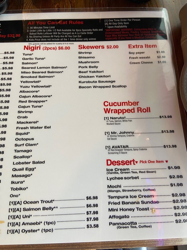 In: Shrimp tempura, spicy crab. Out: Tuna, salmon, super white tuna with so sauce.